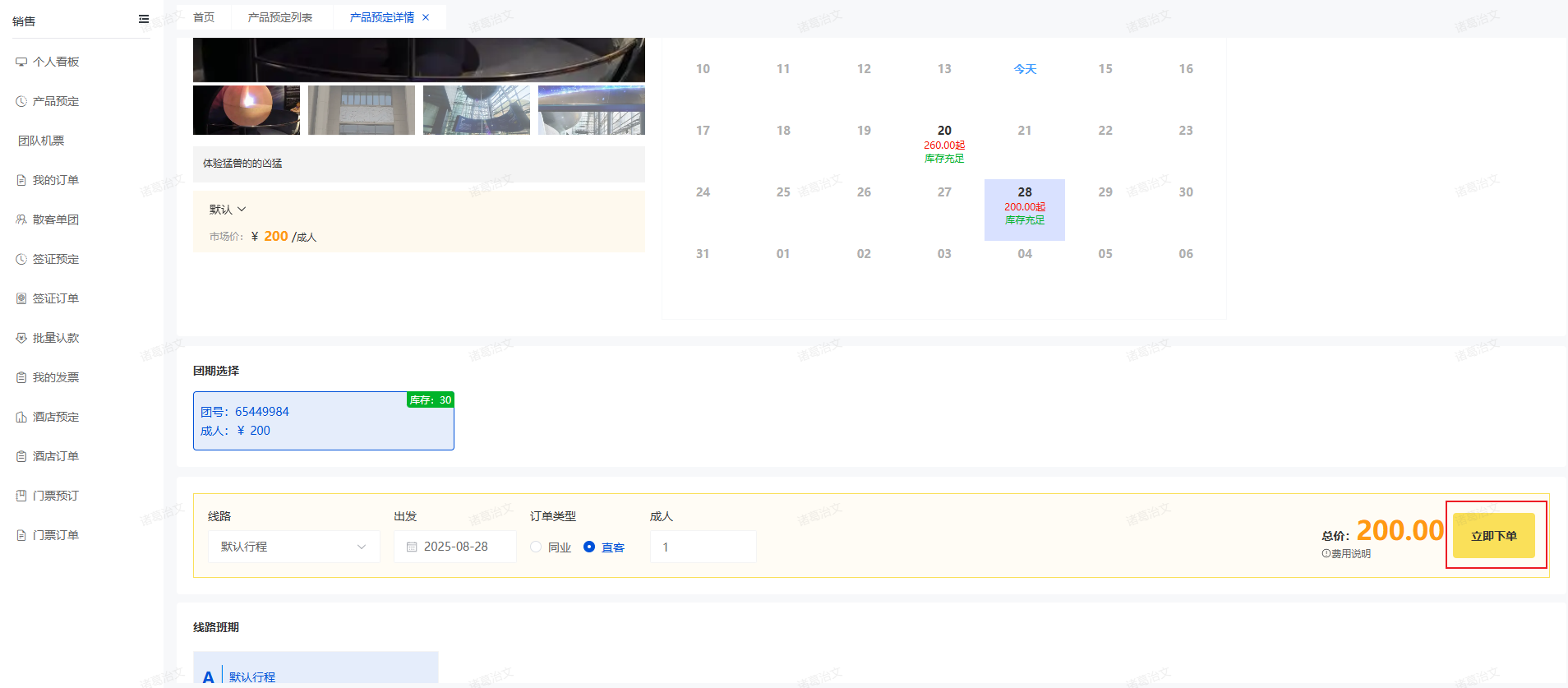 b、选择有团期库存的日期,然后选择套餐、订单类型,录入订单人数,点击“立即下单”按钮,如下图所示。就会跳转到下单确认页面,进行确认下单了。