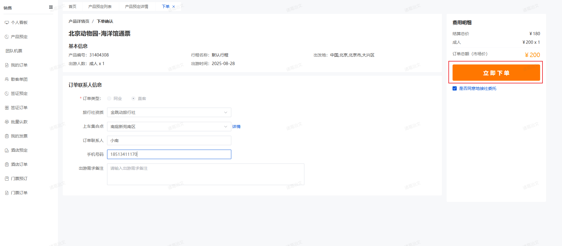 c、正确录入人员的信息,如下图所示,点击“立即下单”按钮,就可以成功下单旅游产品了