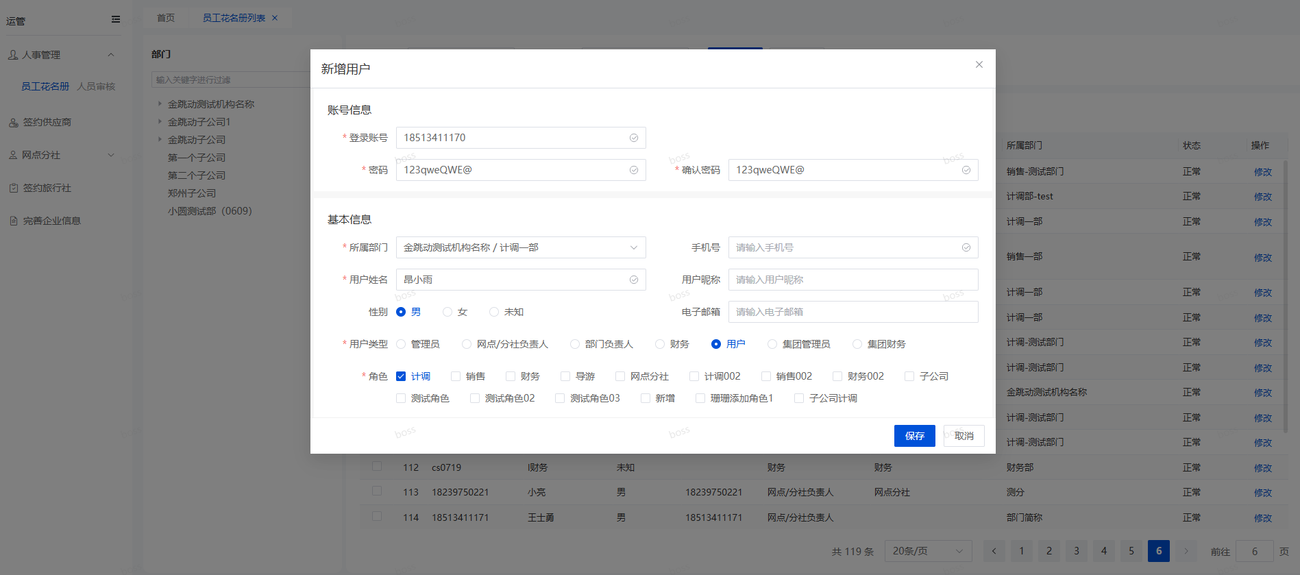 在员工花名册页面,点击“新增用户”按钮,就会弹出新增用户窗口,录入人员的信息保存后,就会成功新增用户。您也可以先选择部门列表的部门,再新增用户,为指定部门添加用户。