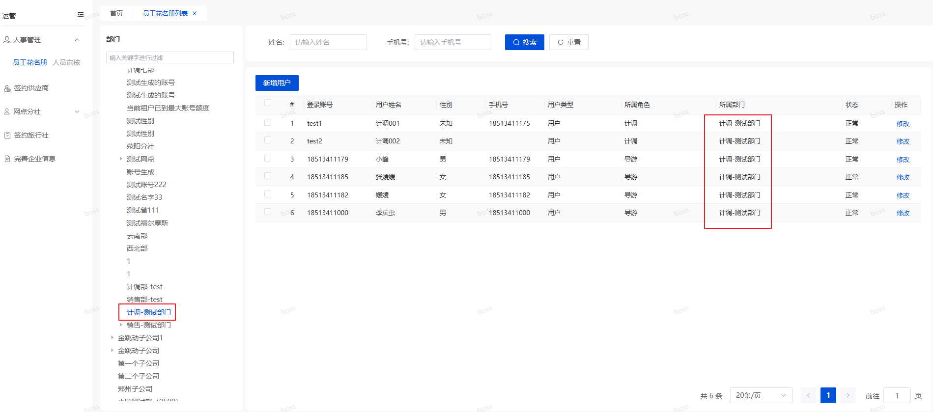 打开运营页面,在人事管理菜单中找到员工花名册,点击就会跳转过去显示本公司的部门与部门下的人员。点击部门右侧就会显示部门下的人员,如下图所示。