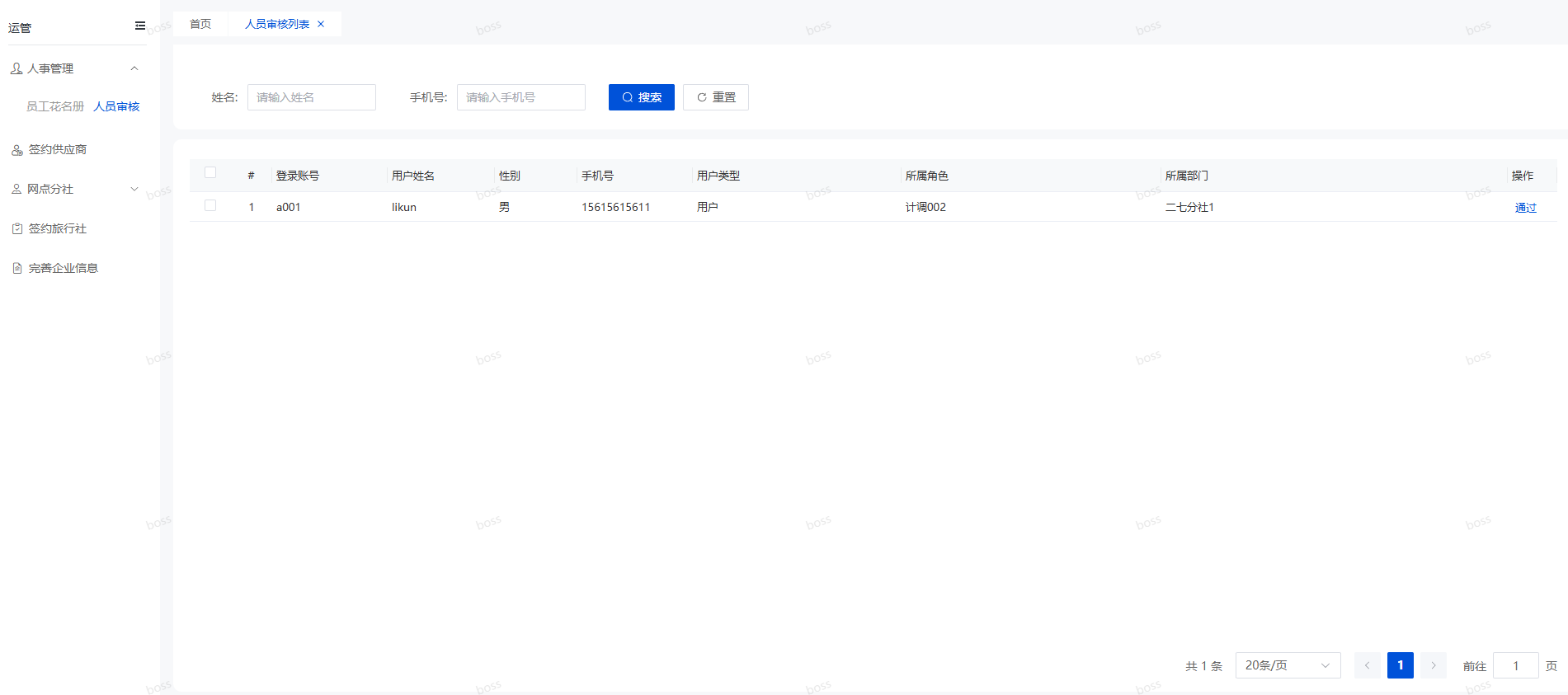打开人员审核页面,在列表找到需要审核的人员,点击“通过”按钮,就会审核成功,这个人员成功添加到系统中。