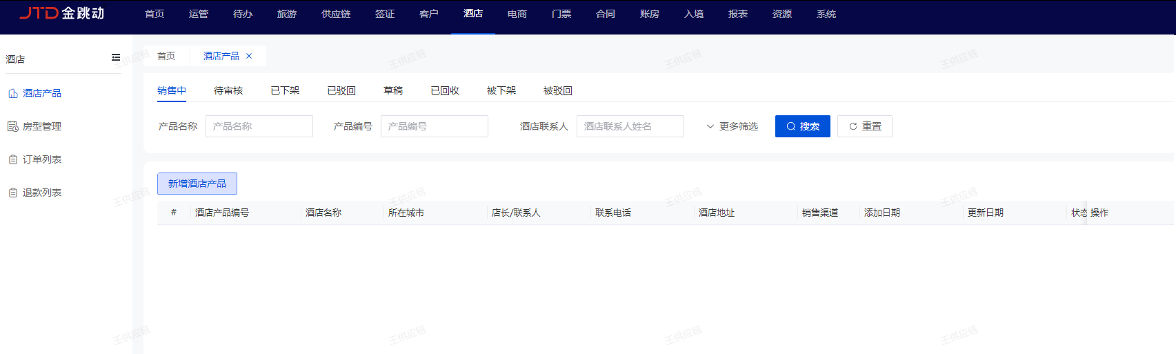 供应链产品管理包括旅游线路产品、出入境签证产品、酒店产品、景区门票四个产品类型,其中旅游线路产品创建维护操作说明已在旅游板块中说明,具体详情请参见“旅游计调”中“添加行程产品”文档中说明内容;