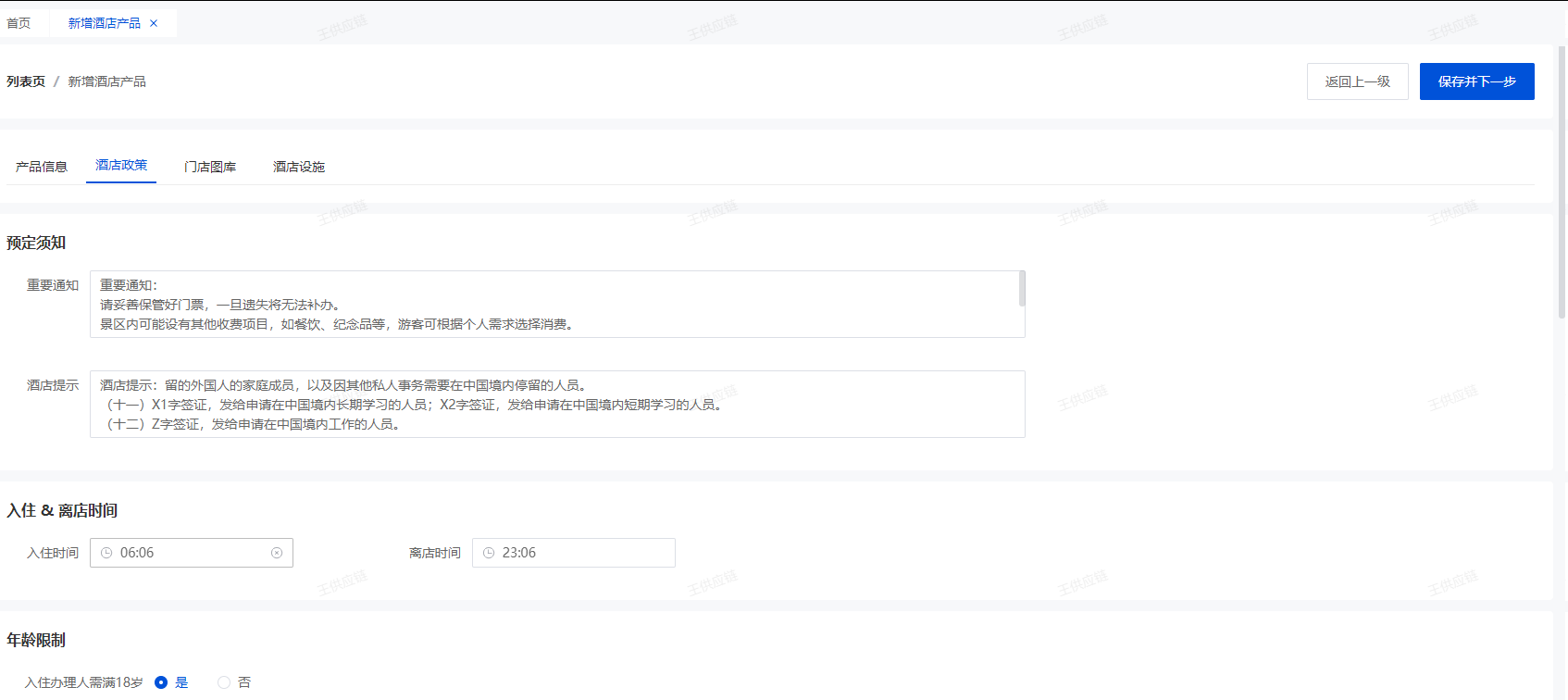 酒店产品信息内容录入完成后点击“保存并下一步”控件可进行第二步输入酒店政策描述信息输入操作: