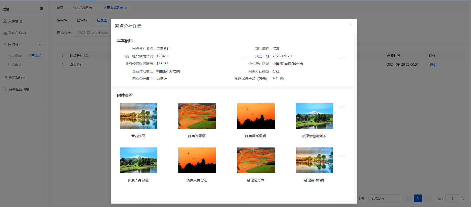 打开网点分社的变更审核页面,找到想要查看的变更申请,点击“详情”,会打开详情窗口,查看网点分社的基本信息和附件,如下图所示。