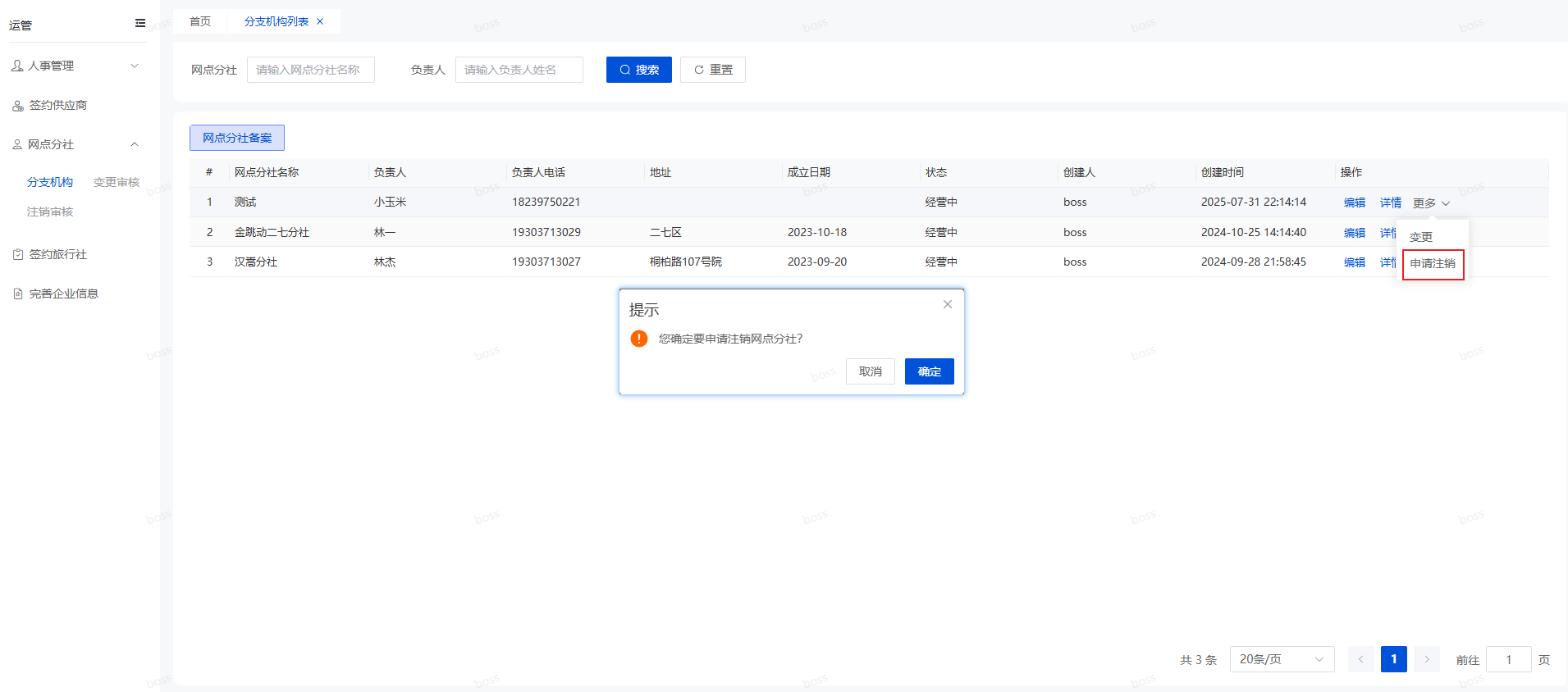 打开分支机构页面,选择需要注销的网点分社,点击操作栏更多里面的“申请注销”按钮,会弹窗提示您是否注销,如下图所示。您点击按钮确认,就会发起注销申请了。