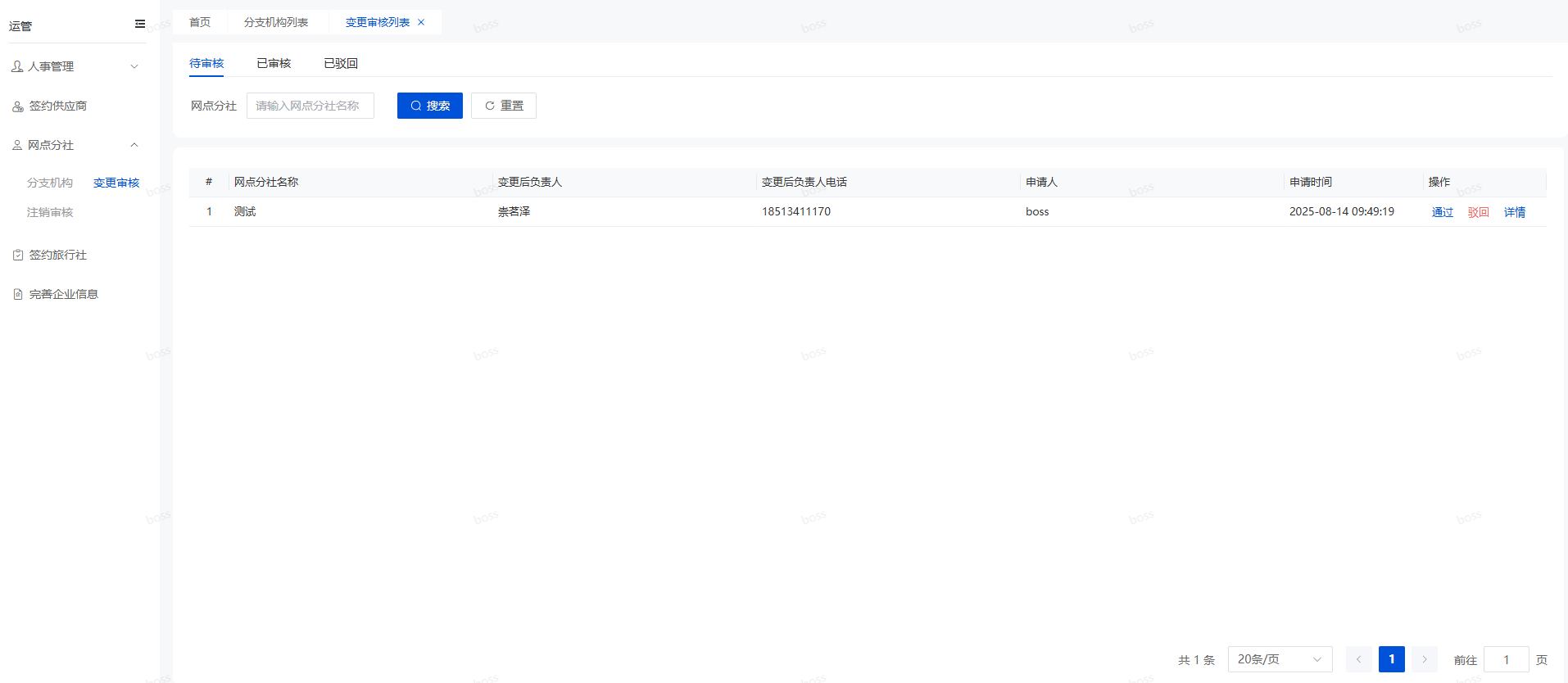 登录系统找到运管菜单,打开网点分社的变更审核页面,如下图所示。可以在该页面对变更申请进行审核。