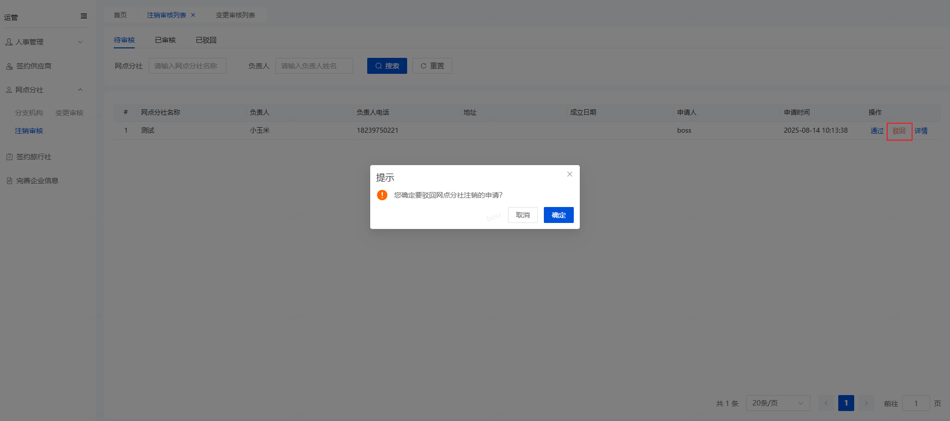 打开注销审核的待审核页面,找到需要审核的注销申请,点击操作栏的“驳回”,会弹窗提示,如下图所示,点击“确定”按钮,该申请就会被驳回,网点分社不会注销,在注销审核的已驳回页面可以查看到被驳回的申请。