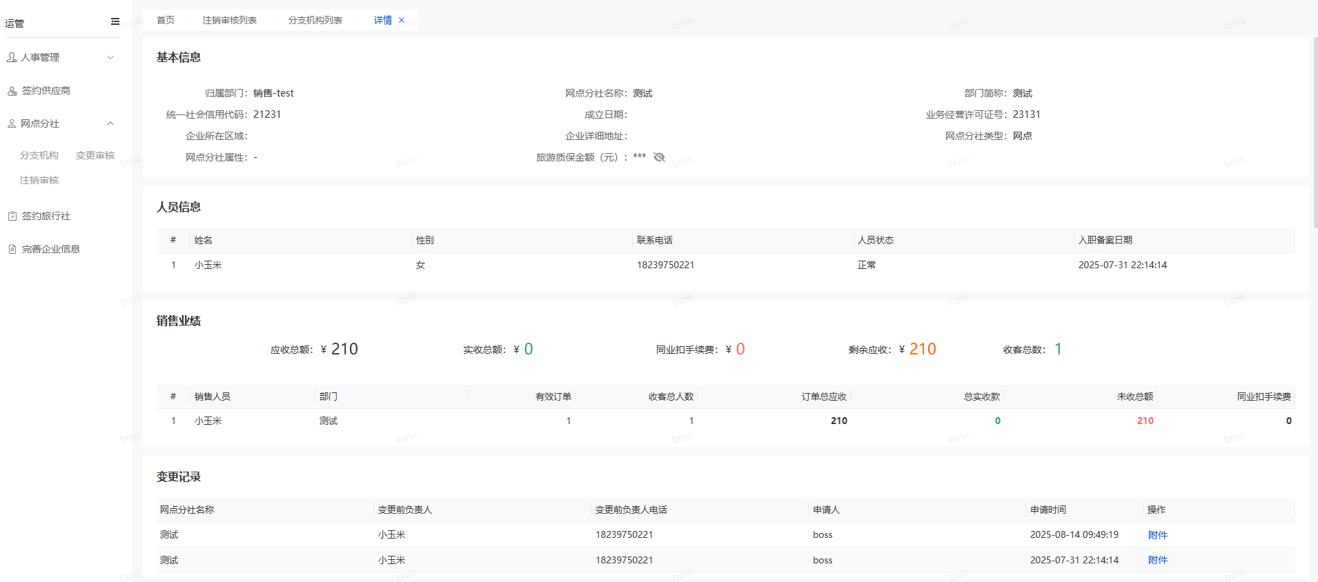 打开分支机构页面,选择您想要查看的网点分社,点击“详情”按钮,会打开详情窗口,如下图所示。可以查看网点分社基本信息、负责人信息、销售业绩等信息。