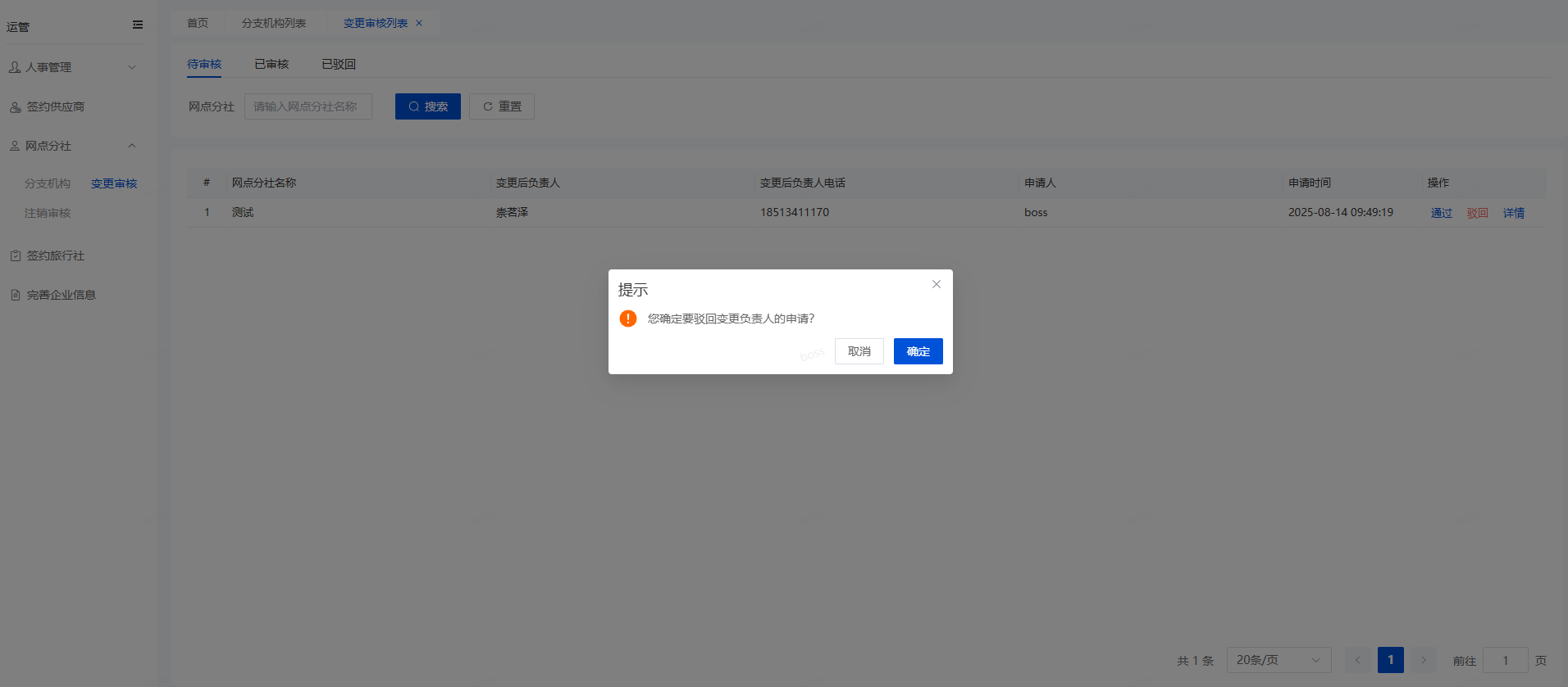 打开变更审核的待审核页面,找到需要审核的变更申请,点击操作栏的“驳回”,会弹窗提示,如下图所示,点击“确定”按钮,该申请就会被驳回,网点分社的负责人信息不会变更,在变更审核的已驳回页面可以查看到被驳回的申请。