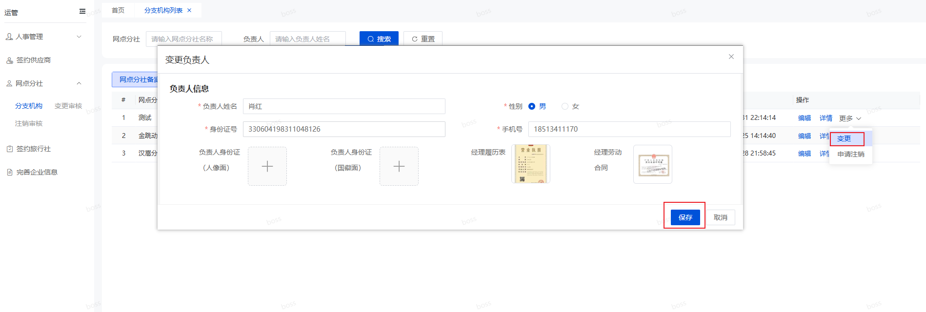 打开分支机构页面,找到需要变更的网点分社数据,点击操作栏更多里面的“变更”按钮,会弹出一个修改负责人窗口,如下图所示。正常修改后保存,就会发起变更申请了。