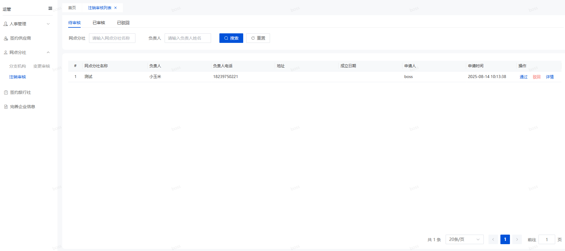 登录系统找到运管菜单,打开网点分社的注销审核页面,如下图所示。可以在该页面对注销申请进行审核。