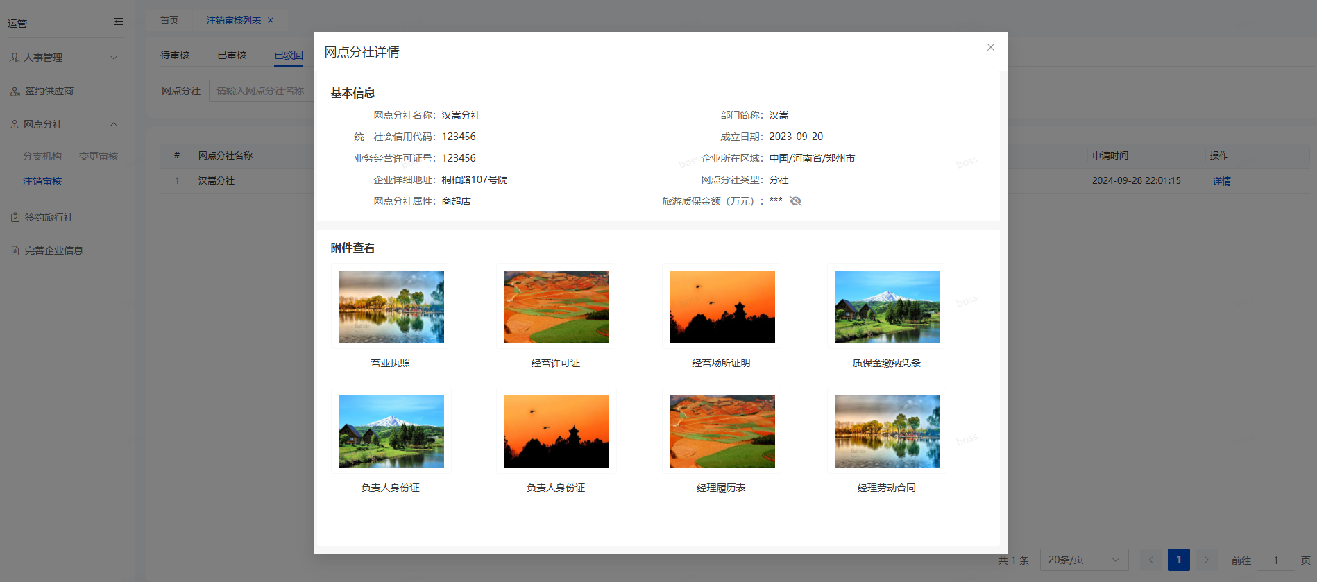 打开网点分社的注销审核页面,找到想要查看的注销申请,点击“详情”,会打开详情窗口,查看网点分社的基本信息和附件,如下图所示。