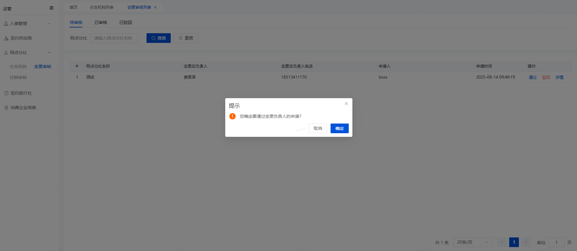 打开变更审核的待审核页面,找到需要审核的变更申请,点击操作栏的“通过”,会弹窗提示,如下图所示,点击“确定”按钮,就会成功审核通过,网点分社的负责人信息变更成功,在变更审核的已审核页面可以查看到审核通过的申请。