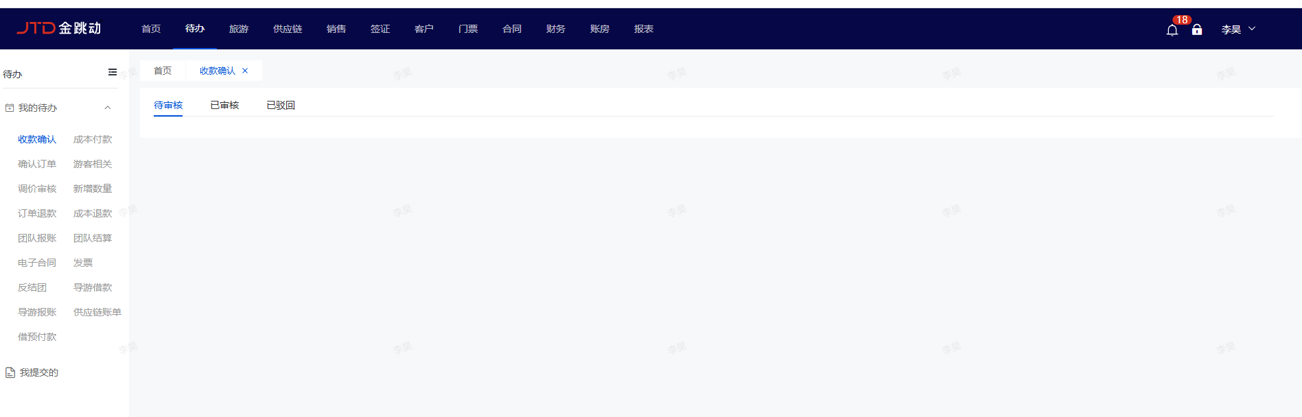 财务人员或有收款确认功能权限用户登录系统,首页点击“ 待办事项”中“收银审核”,或点击导航菜单“待办_我的待办 ”中“收款确认”可对收款记录进行审核确认操作;