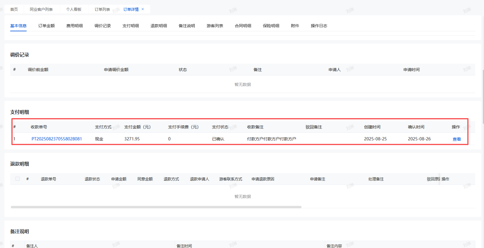 客户支付成功后订单详情中支付明细显示相应的支付记录,点击”查看“可查看支付详情信息。