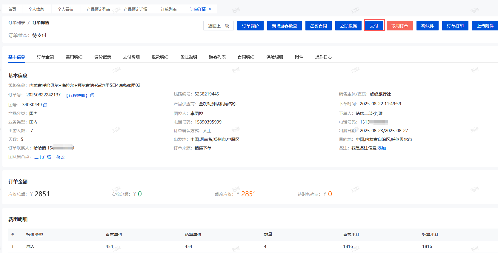 销售中心人员登录系统:销售–我的订单,我的订单页面选择已被计调人员确认的订单,进入订单详情页面,点击“支付”控件,即可进行订单支付收款业务操作;